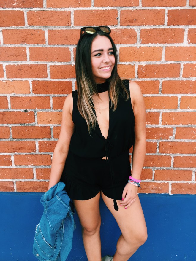I chose a jacket with fun patches on the shoulders and back to add color and dimension to the look. Anna, on the other hand, chose to show detail in her black romper with a tie in the front and a black choker. x